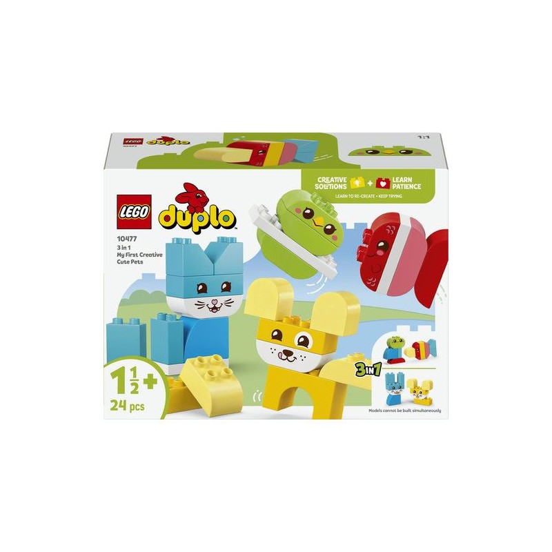 Preencha os momentos de brincadeira com cor e criatividade com o LEGO® DUPLO® My First Animais Criativos Adoráveis 3 em 1 (10477). Este adorável brinquedo de animais para rapazes e raparigas com 18+ meses oferece 8 opções de construção com as mesmas peças. Usando as 24 peças fáceis de utilizar concebidas especialmente para as mãos pequeninas, os pequenos construtores podem escolher entre figuras de cão, gato, pássaro, coelho, rato e peixe.