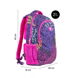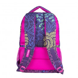 Mochila escolar com 2 fechos Zip . Série especial pirilampo, estampagem criada por diferentes formatos de vegetação e folhas, que representa o ambiente onde vivem os pirilampos. As cores são tão vivas quanto a luz dos pirilampos: lilás, fúcsia, amarelo e verde, que se destacam sobre uma base lilás escuro.