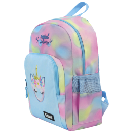 Bolsa para utilização pré-escolar produzida pela cerdá do Stitch. Com alças e costas ergonómicas e almofadas. revestidas com tecido respirável para melhorar o conforto. Segunda bolsa menor frontal com fecho individual. Duas bolsas laterais abertas em tecido de rede. Asa de mão na parte superior