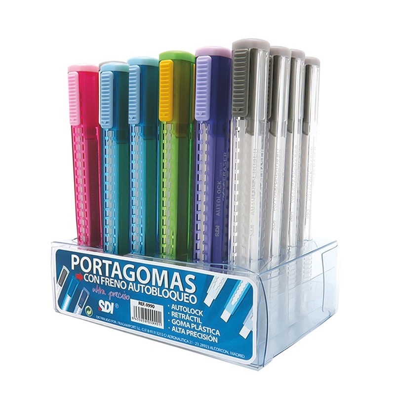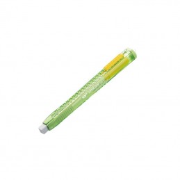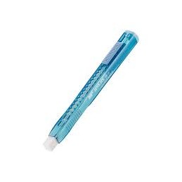 Borracha em forma de Caneta ergonómica com travamento automático impedidno o retorno da borracha quando é utilizada.